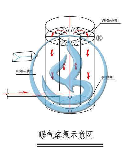 在曝氣溶氧(吐故納新器)中,源水從其中的內(nèi)桶上升,在頂端溢流流到360度輻射水槽中,在水槽中水流分三部分跌落,在空中形成三個極薄的水幕。也就是說水流充分細(xì)分,增大水流與空氣的接觸面積,使得水中富含溶解氧,同時水體中的有機(jī)物、含氮磷物質(zhì)、氨氣、二氧化碳等有害氣體從水流表面溢出。