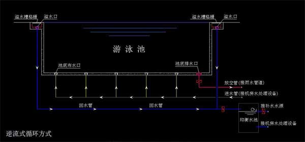 逆流式水循環方式是指泳池的全部循環水,經設在池底的給水口或給水槽送入游泳池內,再由池壁外側的溢流槽溢流取回,進行水處理后再送回池內繼續使用的水流組織方式。
