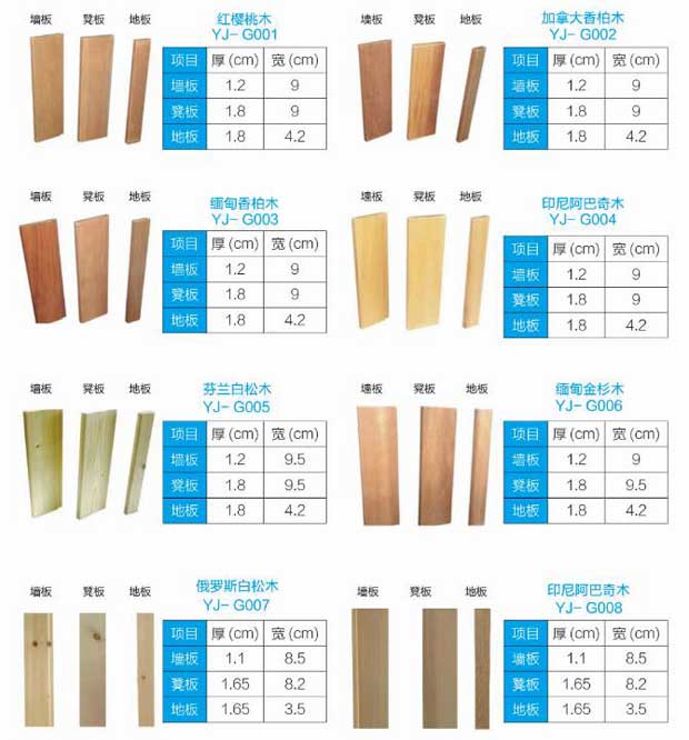 材質(zhì)很多如:紅櫻桃木、加拿大柏木、緬甸香柏木、印尼阿巴奇木、芬蘭白松木、緬甸金杉木、俄羅斯白松木
